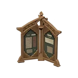 Эта доска объявлений состоит из трёх стендов и соединяющего их каркаса. Ей регулярно пользуются многие торговцы в городе Сумеру.